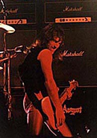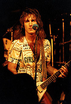 August performed a lot of original music, but also did covers of Van Halen, AC/DC, and the like. August was infamous for being LOUD! Dave said he had three full double Marshall stacks behind him. (Six 4x12 speaker cabinets and six (yes six) Marshall heads. (With REO Dave has the equivalent of 1/3 of this power on stage.) Dave said the club management used to complain about the volume, so he'd put an August tee shirt over the bottom speaker cabinet. That explains the August logo on the lower cabinet in the photo lower left. I doubt this had much effect on the db level. Mark Estralla says he has a 20% hearing loss in his right ear, which he attributes to one night at the Mohawk Club in Fitchburg, Mass. Where he had to set up the lighting console in the front of the band, about 25 feet from the stage. He was right in front of Dave's massive Wall O' Marshalls, and suffered through three brutal sets.