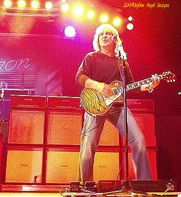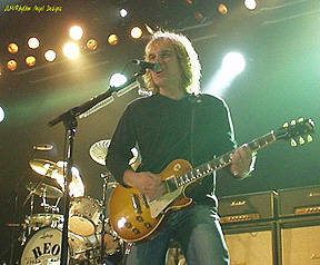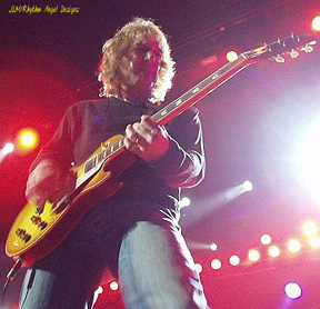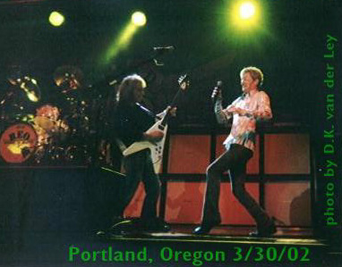 Deb van der Ley sent in this action shot which is from the Portland OR show. Not a bad photo for a disposable camera. Notice Dave playing his new Gibson Flying V guitar. |