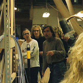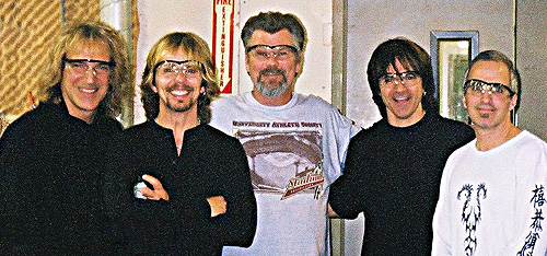 While on tour, REO and Styx found themselves near the Gibson Acoustic guitar works in Bozeman, MT. Pictured here left to right are: Dave, Tommy Shaw, Carl Lewis (Gibson craftsman), Lawrence Gowan, and Glen Burtnik. |