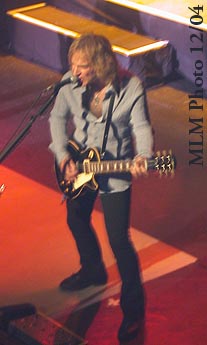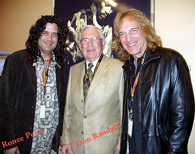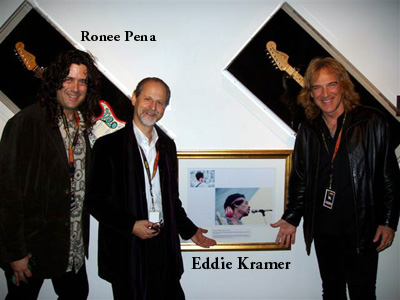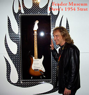 12/14/04 You might think that being off the road, Dave would be taking it easy. No way! Recently Dave attended the opening of the new Fender Museum in Corona, California. Dave loaned to Fender, four of his vintage Stratocasters for display. These guitars are his 1954 Sunburst Strat, 1955 Custom Color Coral Pink Strat, 1958 Strat in Desert Sand, and his 1964 Start in Olympic White. The guitars are on a six month loan. Dave's Custom Shop guitar builder and buddy Ronee Pena served as Dave's host. Dave had the pleasure of meeting several people who are prominent in the history of Fender guitars. Two of those, pictured above are Don Randall who named the Stratocaster and Telecaster guitars, and Eddie Kramer: famed producer to Jimi Hendrix (Led Zep, KISS, Stones and others.) Many thanks to Ronee Pena for sending photos and details. To see more, go to www.fendermuseum.com. To learn more about Mr. Kramer, visit www.kramerarchives.com.