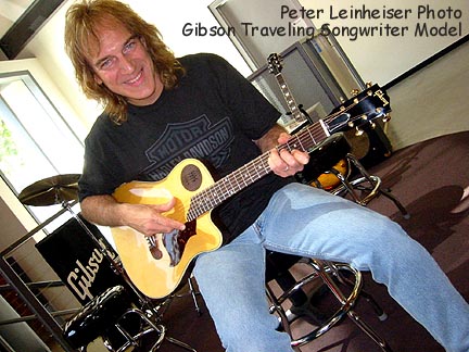 04/02/05 Many thanks to Peter Leinheiser of Gibson Guitars for sending the cool photo below. Dave is trying out a new Gibson guitar model not yet available to the public. It is called the Traveling Songwriter.